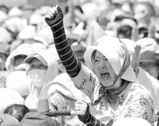 16日上午11时,虽然离集会的主要活动开始还有2个小时的时间,通往代代木公园的道路上已经人满为患。反对核电集会于中午时分开始,来自日本各地的10万余民众头顶炎炎烈日,汇聚到位于东京涩谷区的代代木公园。集会活动还引来了大批路人的围观,会场上时而响起“守护儿童们未来”的口号声。