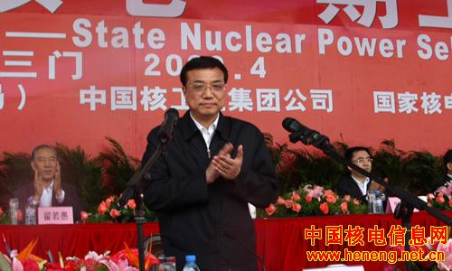 2009年4月19日,三门核电站建设现场春风阵阵、春雨飘飘,三代核电AP1000自主化依托项目——中核集团浙江三门核电一期工程开工仪式在这里隆重举行。中共中央政治局常委、国务院副总理李克强带着党中央、国务院的亲切关怀莅临开工现场,宣布开工并看望工程建设者。他强调,要贯彻落实党中央、国务院的战略部署,积极推进核电建设,大力发展新能源产业,为保障我国能源安全、促进经济平稳较快发展作出新贡献。