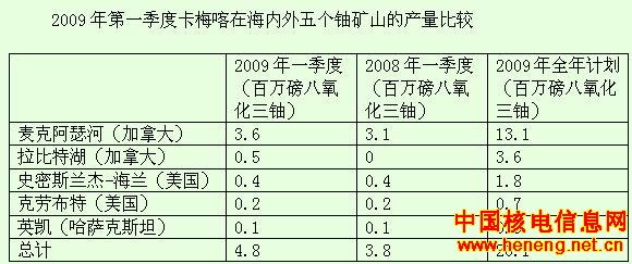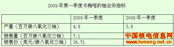 展望2009年,2009年的铀销售量是32-34百万磅八氧化三铀,早先预计的铀销售量是31-33百万磅八氧化三铀。现在预计2009年公司在铀业务上的收入会比2008年下降大约2%-5%,早先的预计数量是下降5%-10%。2009年的产品销售成本则比2008年上升5%-10%。