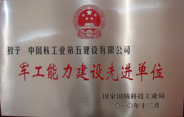 日前,国防科技工业局授予中国核工业第五建设有限公司(以下简称中核五公司)“军工能力建设先进单位”称号。