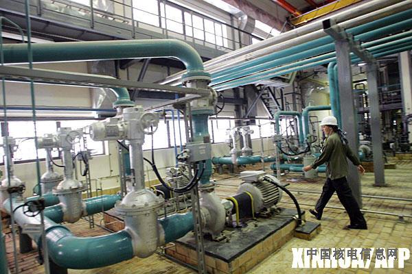 资料图:在伊朗首都德黑兰以南约1200公里的布什尔核电站,一名俄罗斯女技术人员从电站内的机械设备旁走过。