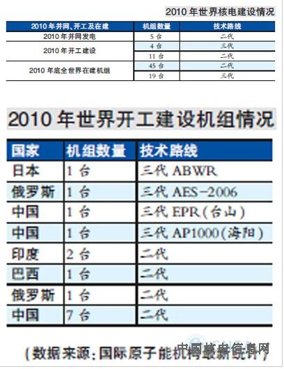 据了解,2010年我国建成2台新的核电机组,投入商运的核电机组增至13台,总装机容量达到1080万千瓦,占世界核电总装机容量(3.75亿千瓦)的2.88%;2010年我国新开工建设10台核电机组,在建核电机组数达到28台,总装机容量为3097万千瓦,占全球在建核电总规模的40%以上。
