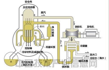 沸水反应堆是利用反应堆对水进行加热,生成蒸汽,然后旋转涡轮机发电。由本刊根据参考文献4)制作而成。