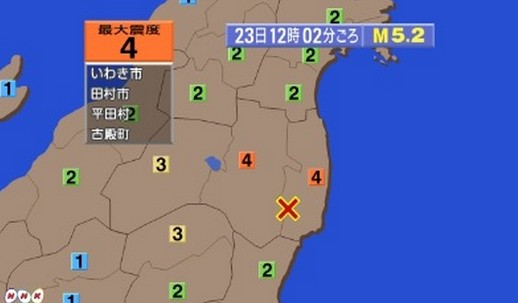 日本气象厅的地震速报称,该震源位于福岛县沿岸,最大地震规模为5.2级,深度为10公里。受此地震影响,福岛县部分地区的震度为4级,枥木县会津地区为3级。此次地震不会引发海啸。