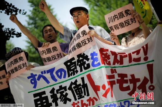 当地时间7月16日上午,日本民众在东京都港区原子能规制委员会所在的大厦前集会抗议川内核电站1、2号机组通过安全审查。