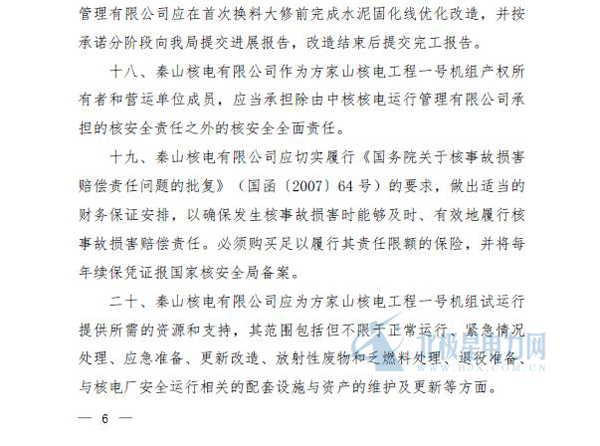 《通知》明确表示,秦山核电有限公司和中核核电运行管理有限公司应按照《秦山核电厂扩建项目(方家山核电工程)一号机组首次装料批准书》规定的条件,严格遵守技术规格书的规定,做好方家山核电工程一号机组装料和装料后的调试工作,加强质量管理,确保装料和装料后试运行阶段的核安全。 以下为《通知》全文: