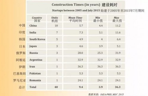 从历史统计数据来看,在最高峰的时候可能有234个在建,但是有48个没有最后联网。比如这个时间段是在70年代中期,80年代的时候,但是现在这种情况还是有的,就是启动了,但是最后在它的开发不同阶段放弃了这个项目。但中国是一个例外,中国过去10年新建机组中占了整体的一半,比如说2006年到2015年,全球一共有75个投入建设,其中39个都是来自于中国,所以中国在过去10年投入新建的项目比例是非常大的。2、全球核电平均服役时长29年中国核电机组的平均年龄只有7年在核能行业经常提到的就是核电厂建设成本很高,但是运行成本很低,这种说法其实我觉得已经终结了。核电站的建设耗时是能够表现它的经济成本一个很好的指标。比如有40个机组,是从2005年到2015年7月份之间总的建设的机组数量,平均的建设时间是9.4年。但是最大值和最小值之间几乎差了10倍,最短的时间不到4年就建成了,最长的36年。中国在这方面占比也是最多的,几乎占到40个其中一半的机组数量。同时也可以发现,俄罗斯10年之间只开始建设了3个机组,今年下半年又建一个机组,可能是建设时长要31年。整体来看,核电项目在俄罗斯建设的平均年限大概是29年,这是相对比较长的建设时间。