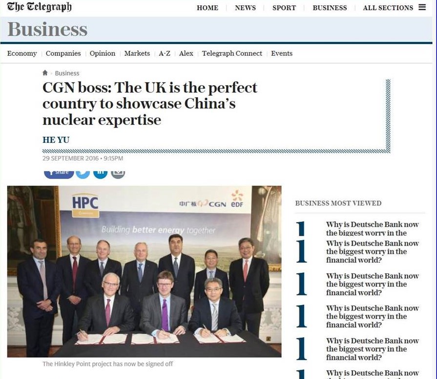 9月30日,在中广核与EDF及英国政府签署英国核电项目一揽子协议的次日,中国广核集团董事长贺禹在英国颇具影响力的《每日电讯报》上发表署名文章,现全文翻译转载如下: