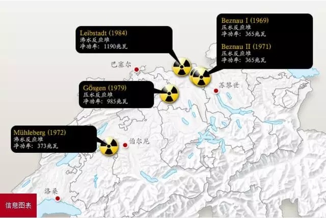 瑞士逾40%的电力来自于核能。所有5家核电站都位于瑞士德语区,落户在阿尔高(Aargau)、索罗图恩(Solothurn)和伯尔尼州。括号内标明的时间是进行商业化运营的年份,核电站的服役期将由此开始计算。