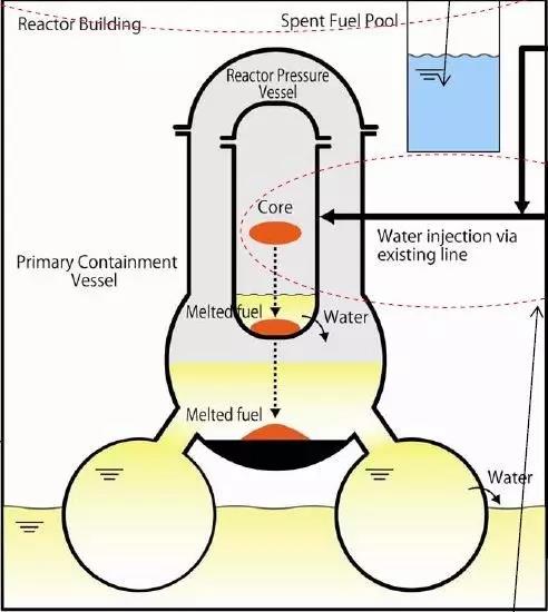 从目前的报道以及日前东电公司给IAEA的事故调查报告来看,实际上压力容器底部早已经熔穿,核燃料流出容器底部后正在熔毁壳内一个金属格栅法兰状结构,此构件已查明是压力容器下的铁质脚手架。