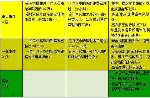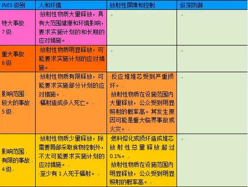 国际核能事故分级表(INES)共分7级,严重程度从0到7级依次增加。其中1至3级为事件,4至7级为事故。众所周知,2011年事故后,3月12日,日本原子能安全保安院将福岛第一核电站核泄漏事故等级初步定为4级。此后,该核电站发生了反应堆燃料熔毁、向外界泄漏放射性物质的情况,日本经济产业省原子能安全保安院根据国际标准将事故等级提升到5级,紧接着,4月12日,原子能安全保安院12日决定,将福岛第一核电站事故的暂定评估等级上调至国际核能事件分级表(INES)中最严重的7级。