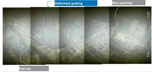 上面三幅图显示出东电公司目前的调查区域与探测路径。在探测机器人进入之后发现了格栅架上有一个1m见方的熔毁塌陷洞,如下图,此洞阻碍了机器人进一步的探测活动。