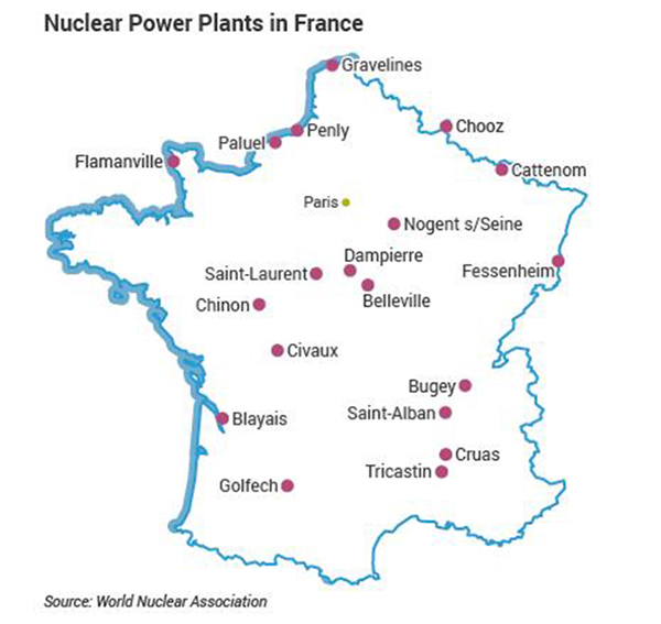 法国现有58台核电机组,分布在19个核电站,全国约有75%的电力供应来自核电。