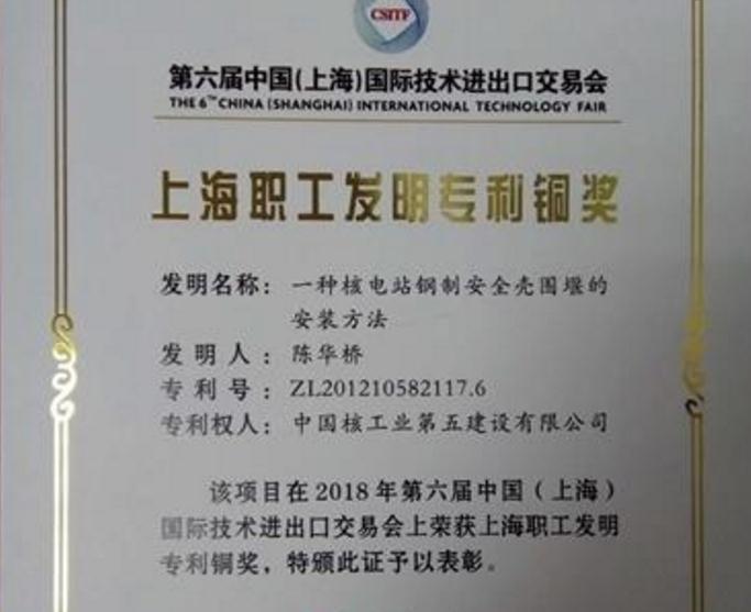 日前,上海市总工会在第六届中国(上海)国际技术进出口交易会上进行了上海一线职工发明专利奖项颁奖仪式,中核五公司储罐建安分公司陈华侨发明的“一种核电站钢制安全壳围堰的安装方法”项目,在交易会上脱颖而出,荣获上海职工发明专利铜奖。