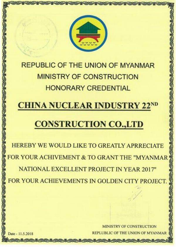 5月份,由中核二二公司承建的缅甸仰光GOLDEN CITY综合体项目获缅甸建设部颁发的“2017年度缅甸国家优质工程奖”荣誉称号。据悉,该奖项尚属首次颁发给非缅甸的企业。