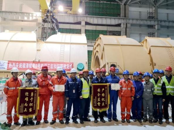 扣缸完成后,福清核电有限公司副总工程师兼工程管理处处长周赛军,中国核电工程有限公司福清项目部副总经理赵宝贵分别代表业主及工程公司授予中核五公司荣誉证书和“勇于担当,迎难而上”锦旗。