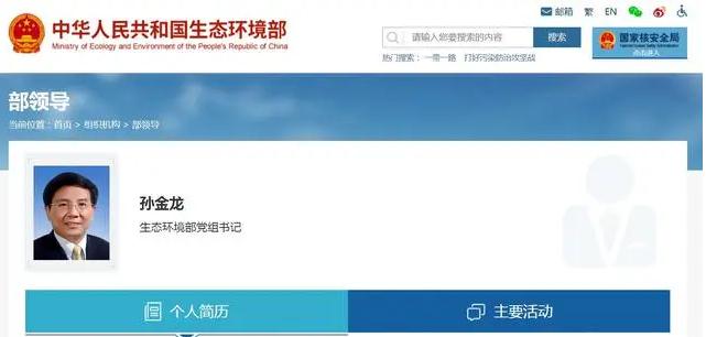 据生态环境部官网“部领导”栏目4月9日更新显示,孙金龙任生态环境部党组书记。