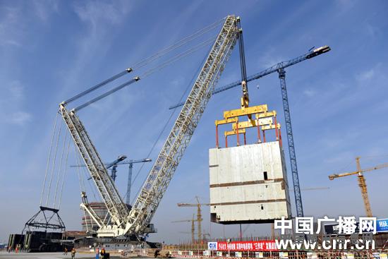 此次吊装的CA20模块是三代核电AP1000中最大的一个结构模块,长21.4米,宽14.2米,高20.9米,近7层楼高,由32个墙体子模块和40个楼板子模块组成18个房间,其功能包括乏燃料的贮存、传输、热交换及废物收集与处理等。CA20模块总重量近800吨,起吊总重量1025.7吨。吊装工作于9时整开始,11时整完成,历时2个小时。