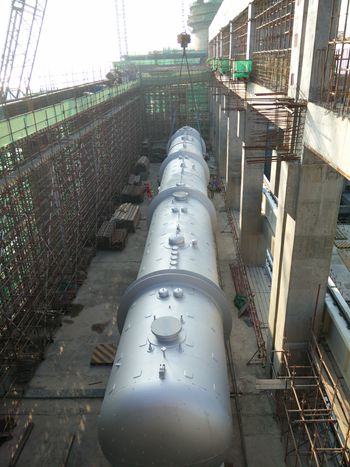 10月20日上午7时58分,经过1天多的努力,随着福清核电4#机组除氧器最后一段(Ⅰ段)的支座与吊装前预装的滚轮准确对位,4#机组除氧器吊装就位工作圆满完成。