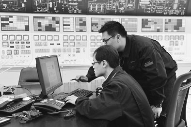 ▲1月29日,秦山核电基地的预备操纵员在主控室模拟机上进行训练。