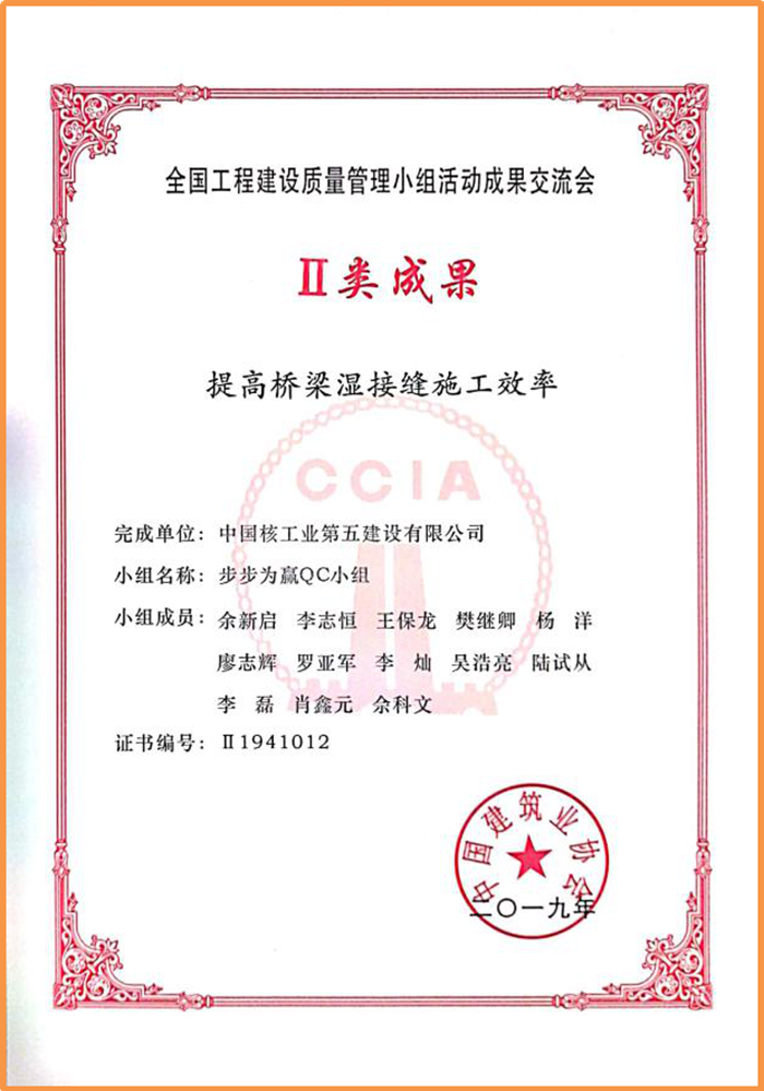 6月27日至28日,中国建筑业协会举办的2019年全国工程建设质量管理小组活动成果交流会在福州举行。在全国建筑业1955个QC成果中,中核五公司张家界项目部《提高钻孔灌注桩成孔一次验收合格率》《提高桥梁湿接缝施工效率》两项QC成果成功入围现场发表赛。发表赛现场竞赛异常激烈,小组代表王保龙经过前期细致的准备、现场精彩的演讲,最终两项成果同时获得了中国建筑业协会全国工程建设质量管理小组活动成果交流二等奖。