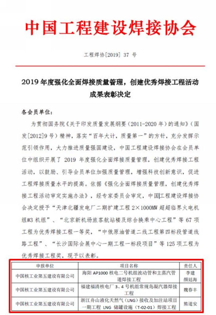 中核五公司三项工程荣获2019年度全国优秀焊接工程一等奖