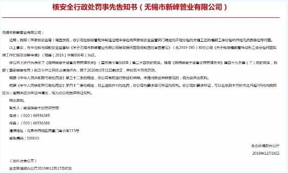 无锡新峰管业 收到 核安全行政处罚事先告知书