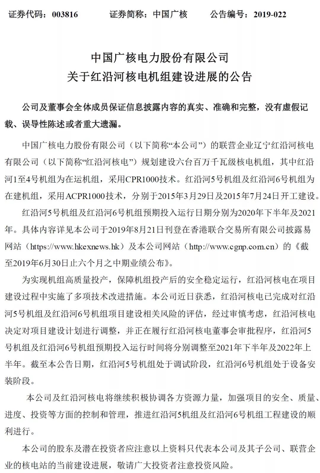 为实现机组高质量投产,保障机组投产后的安全稳定运行,红沿河核电在项目建设过程中实施了多项技术改进措施。据悉,红沿河核电已完成对红沿河5号机组及红沿河6号机组项目建设相关风险的评估,经过审慎考虑,红沿河核电决定对项目建设计划进行调整,并正在履行红沿河核电董事会审批程序,红沿河5号机组及红沿河6号机组预期投入运行时间将分别调整至2021年下半年及2022年上半年。