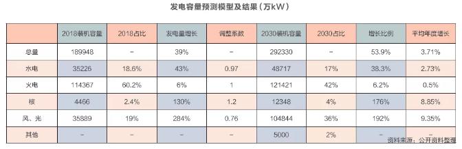 各能源形式的发电量预测则根据工程判断以及资源储量和全球互联网模式下的大规模清洁能源开发设想和推进情况进行预测,其中火电2030年发电量测算为52267.5亿kWh,加上上述水电、核电、风电和太阳能的测算,2030年总发电量在9.7万亿kWh左右。
