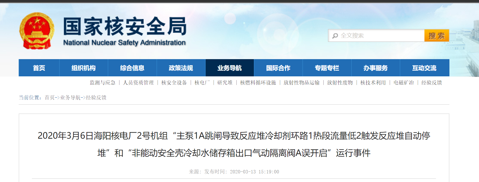 国家核安全局发布了2020年3月6日海阳核电厂2号机组“主泵1A跳闸导致反应堆冷却剂环路1热段流量低2触发反应堆自动停堆”和“非能动安全壳冷却水储存箱出口气动隔离阀A误开启”运行事件情况,详情如下: