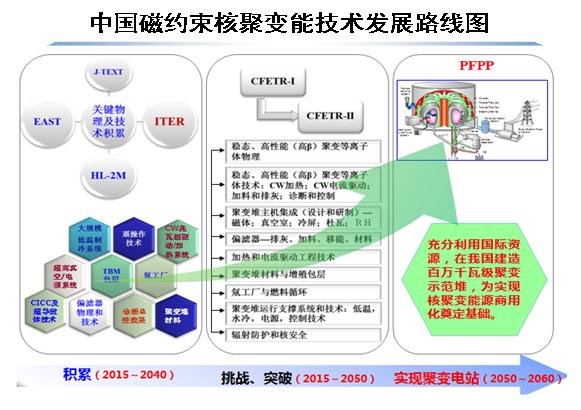 我国磁约束核聚变能发展战略:以建立近堆芯级稳态等离子体实验平台,消化、吸收、发展和储备聚变工程实验堆关键技术,开展聚变工程实验堆设计研究和关键部件预研为近期目标(截至2020);以建设、运行聚变工程实验堆,开展稳态、高效、安全的热核聚变堆科学研究为中期目标(2020-2050);以发展核聚变电厂,探索核聚变商用厂的工程技术可行性、环境可行性和经济可行性为长远目标(2050-2060)。我国磁约束核聚变能发展路线图如下所示: