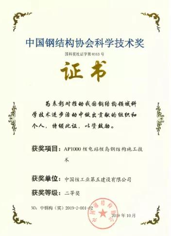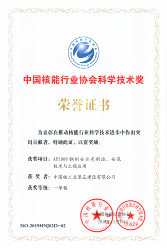 2019年,中核五公司科技创新项目蓬勃发展,其中,中核集团立项2项,中国核建立项4项,公司自主立项8项;获得发明型专利授权21件,软件著作权2项,美术作品著作权1项。2019年共计获得省部级及以上科技奖8项,其中,“一种核电站冷却剂系统主管道的安装方法”荣获第二十一届中国专利优秀奖,该奖项也是中核五公司继2016年、2017年之后第三次荣获此项荣誉。