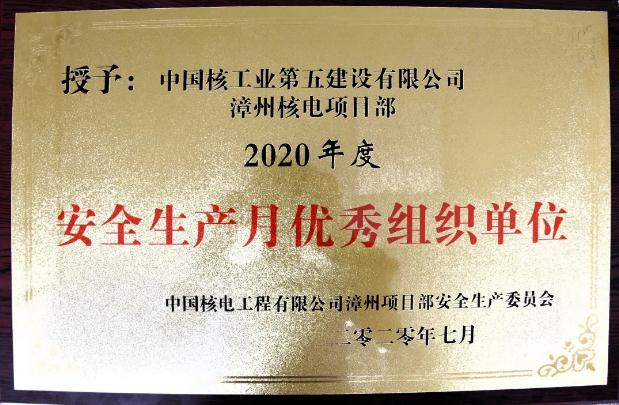 中核五公司漳州核电项目部荣获“安全生产月优秀组织单位”荣誉