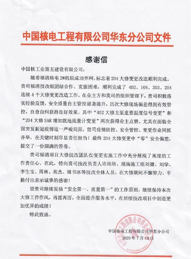 7月13日,中核五公司福清核电项目部收到中国核电工程有限公司华东分公司发来的感谢信,对项目部圆满完成福清核电机组大修施工任务表示感谢。