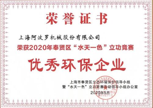 近日,上海阿波罗机械股份有限公司(下称“阿波罗公司”)荣获2020年度奉贤区“水天一色”立功竞赛优秀环保企业称号。