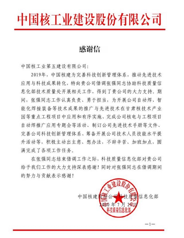 信中对中核五公司工程研究院借调员工张强在工作中认真负责,勇于担当,为开展公司自动焊、智能化焊接装备等技术成果的推广与先进技术在甘肃核技术产业园等重点工程项目中应用和有序实施、制订公司先进技术手册等文件、完善公司科技创新管理体系等活动中积极建言献策、不辞辛苦、加班加点,圆满完成各项工作任务表示感谢。