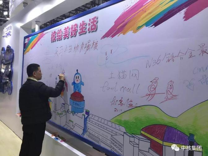 “中核最棒!”“华龙一号国之骄傲”……在“核绘美好生活”绘画墙上,参观者添上了这样的留言。此外,中核展区内还设置了VR实景体验华龙、贴图跳远赢奖品等互动环节,通过形式多样的活动拉近与公众之间的距离。