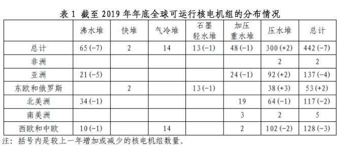 截至2019年年底,全球可运行核电机组442台,较2018年减少了7台。其中,2/3的在运核电机组为轻水堆堆型。表1为截至2019年年底全球可运行核电机组的分布情况。