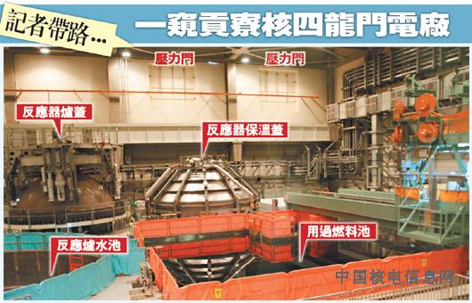 龙门电厂(核四)一号机反应炉厂房首度对媒体曝光。其中反应炉水池(蓝色围墙)、用过燃料池(橘红色围墙)、反应器炉盖(棕色),反应器保温盖(银色)。上方墙上的四方形的压力门,当反应器厂房压力过大时,此压力门会自动打开泄压,防止反应器厂房爆炸。