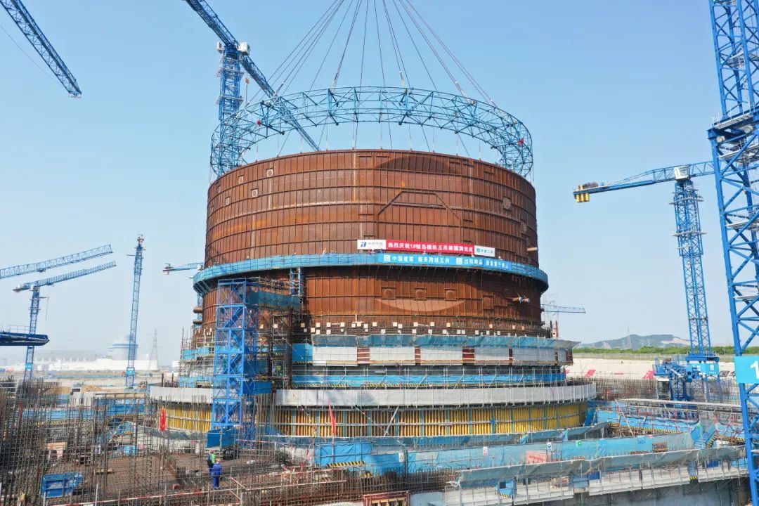 本次吊装的模块五由筒体五层、筒体六层及附属的多个贯穿件套筒以及预埋件组成,是目前石岛湾核电扩建一期核岛钢衬里模块中一次性吊装高度最高的模块。